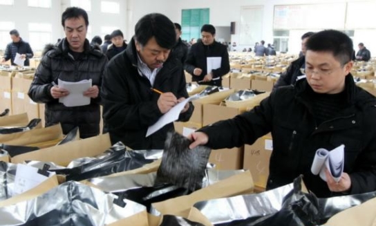 2月28日,中外客商在投標(biāo)會(huì)上查看干紫菜樣品、填寫投標(biāo)書。當(dāng)日,江蘇省第三屆紫菜交易會(huì)在如東縣天一紫菜交易市場(chǎng)舉行,近31000箱干紫菜進(jìn)場(chǎng)交易。由于受天氣環(huán)境等因素影響,今年紫菜產(chǎn)量較往年同期相比下降近50%,紫菜的單張價(jià)格上漲40%左右。這次交易會(huì)吸引了日本、美國(guó)、澳大利亞等10多個(gè)國(guó)家和山東、福建、廣東等沿海一帶地區(qū)近400位中外客商進(jìn)場(chǎng)搶購(gòu)紫菜。