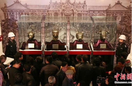 3月31日,“2012保利圓明園國寶暨南北朝佛像展”開幕式在杭州蕭山區(qū)隆重舉行。1860年,英法聯(lián)軍火燒圓明園,萬園之園付與一炬,珍惜文物慘遭流變,其中十二生肖國寶不知所蹤。圖為此次在杭州展出的圓明園豬首、牛首、虎首、猴首。(來源:中新網(wǎng))