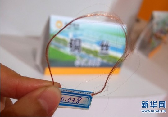 5月11日,記者在展會現場看到的山東某展商帶來的直徑為0.038mm的雙零線,這種銅絲廣泛用于手機震動器和軍工產品,其直徑比頭發(fā)絲還細。(來源:新華網)