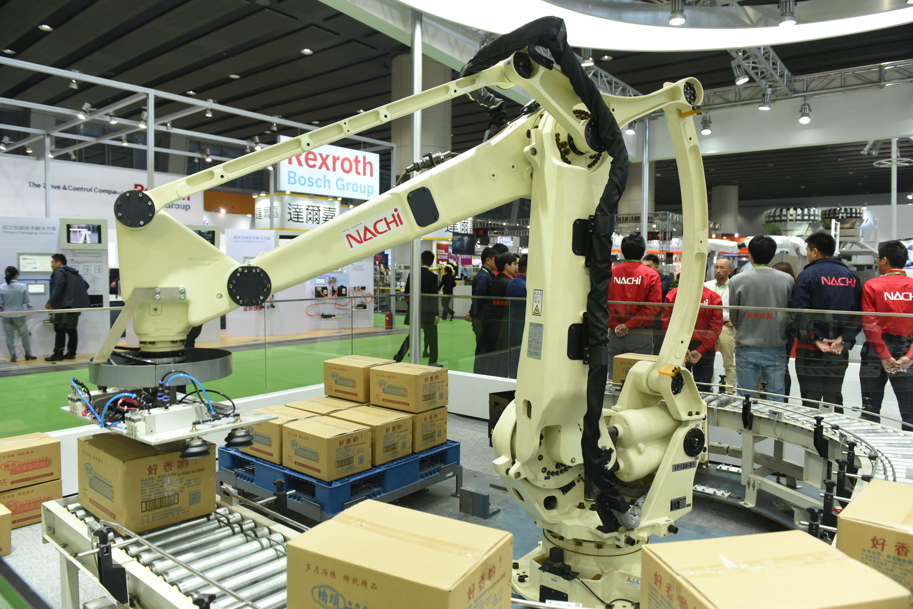 智能展區(qū)匯聚包裝智能巨頭同場競技:ABB 現(xiàn)場演繹IRB 360機(jī)器人,其集成的視覺系統(tǒng),如同機(jī)器人的“眼睛”,識別部件的尺寸、形狀和位置變化; 那智NACHI高精度機(jī)器臂MZ12,把設(shè)置面積減小了17%、本體品質(zhì)減輕了29%,擁有同等級別以上的工作范圍;史陶比爾TX2系列機(jī)器人兼顧了協(xié)作安全性及高速度,重新定義了機(jī)器人性能;優(yōu)傲協(xié)作機(jī)器人的傳送帶將跟蹤抓料及碼垛應(yīng)用結(jié)合,大大縮短了程式設(shè)計(jì)和部署系統(tǒng)所需的時(shí)間。