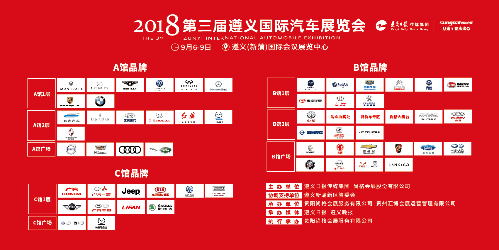 遵義國際車展歷經(jīng)三載的車市磨礪,展出規(guī)模規(guī)格不斷升級。2018遵義國際車展累計吸引近60個汽車品牌、600余款車型華麗亮相。全面啟用遵義(新蒲)國際會議展覽中心A、B、C三個室內(nèi)展館及室外廣場展區(qū),其中B館的外廣場繼續(xù)沿用近4000平米的進(jìn)口德國大棚,多個品牌以原廠高規(guī)格展具入駐,進(jìn)一步彰顯了遵義國際車展的實力。