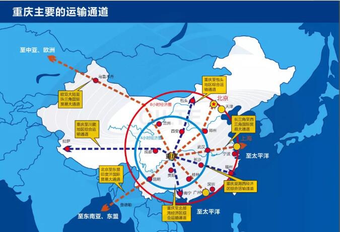 重慶是西部大開發(fā)的重要戰(zhàn)略支點,是“一帶一路”和長江經濟帶的聯(lián)結點。重慶向東有長江黃金水道、向西有中歐班列(重慶)、向南有“國際陸海貿易新通道”、向北有“渝滿俄”班列,立足內陸、面向國際;