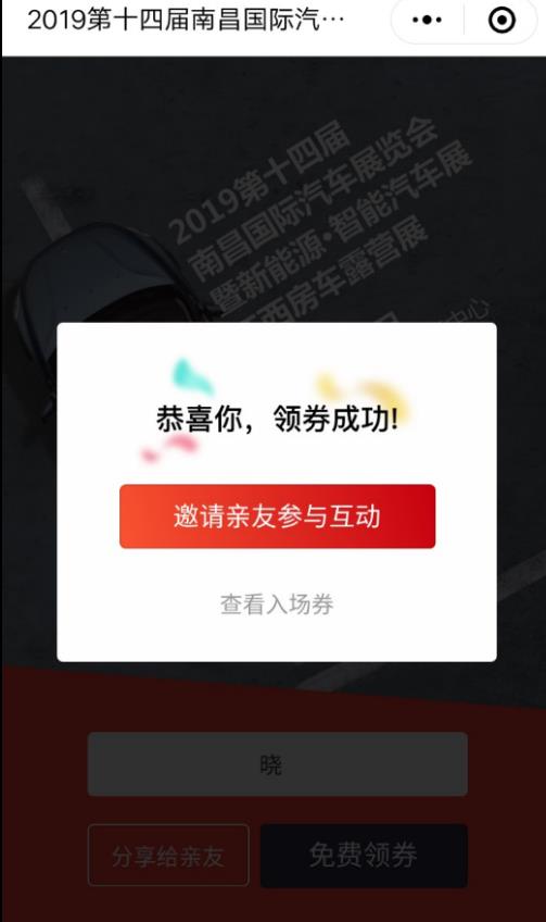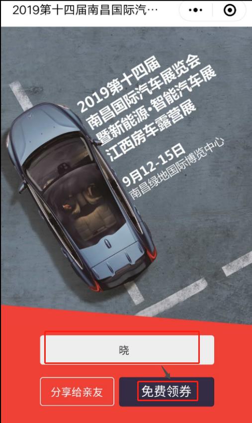 1、識(shí)別圖中“南昌國(guó)際車展”小程序碼,輸入昵稱點(diǎn)擊“免費(fèi)搶券”允許小程序授權(quán)微信;