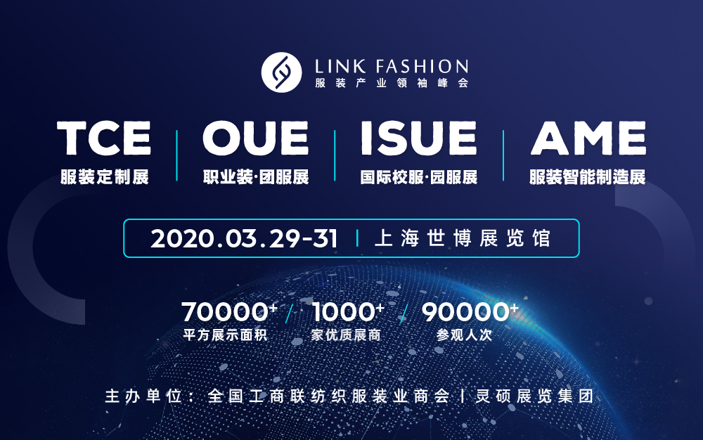 由中華全國工商聯(lián)紡織服裝業(yè)商會與靈碩展覽集團(tuán)主辦的“2020 全球服裝產(chǎn)業(yè)領(lǐng)袖峰會”融合旗下四大品牌展會TCE 服裝定制展,OUE 職業(yè)裝 • 團(tuán)服展,ISUE 國際校服 • 園服展,AME 服裝智能制造展,將于 2020 年 3 月 29-31日在上海世博展覽中心舉行, 超過 70000 ㎡展示面積,1000+優(yōu)質(zhì)參展商,90000+ 參觀人次,超 20 場會議活動。 屆時將匯聚國內(nèi)外紡織服裝行業(yè)精英領(lǐng)袖,傾力打造全球服裝產(chǎn)業(yè)頂級盛會。