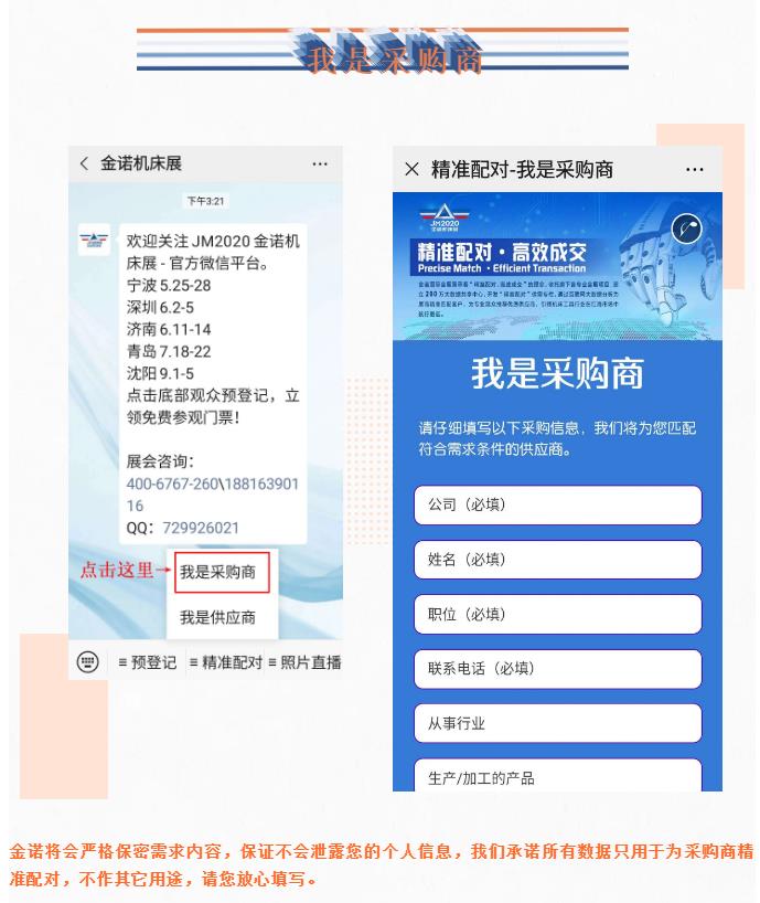 考慮到突發(fā)的疫情可能為您的觀展或采購造成不便,為了給您帶來最舒適的采購體驗,節(jié)省您的采購時間,找到更適合的產(chǎn)品,金諾機床展托旗下各專業(yè)會展項目,建立200萬大數(shù)據(jù)共享中心,開發(fā)“精準配對”供需專欄,通過互聯(lián)網(wǎng)大數(shù)據(jù)分析為展商精準匹配客戶,為專業(yè)觀眾推薦優(yōu)質(zhì)供應商,引領機床工具行業(yè)在紅海市場中航行更遠。